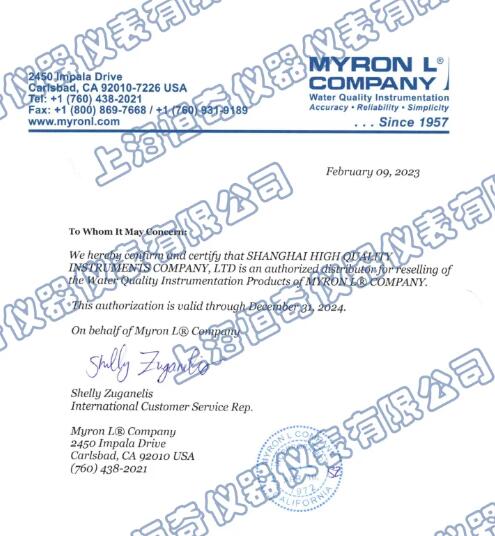 上海恒奇儀器儀表有限公司為美國麥隆公司(Myron L® )在中國大陸地區(qū)指定唯1授權(quán)經(jīng)銷商。