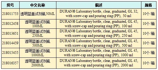 DURAN®藍(lán)蓋玻璃瓶現(xiàn)貨產(chǎn)品如下: