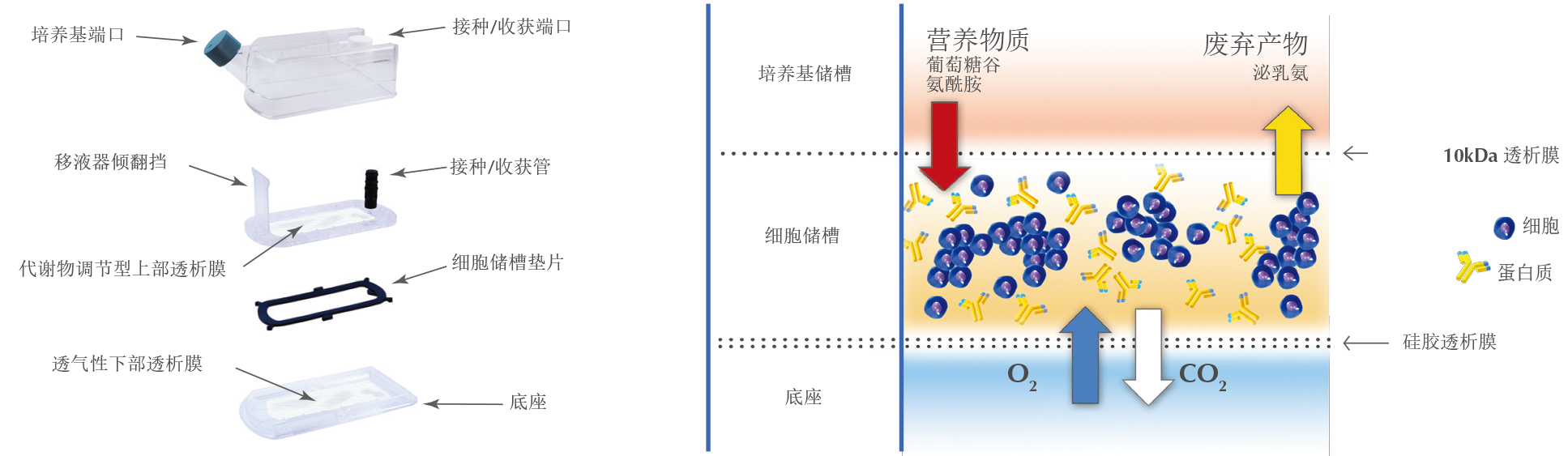 上層透析膜的允許透過分子量小于10 kDa 的營養(yǎng)物質,從培養(yǎng)基室滲透到細胞室,代謝抑制物從細胞室滲透到培養(yǎng)基室,并且保證所有目的蛋白質仍留在細胞室。