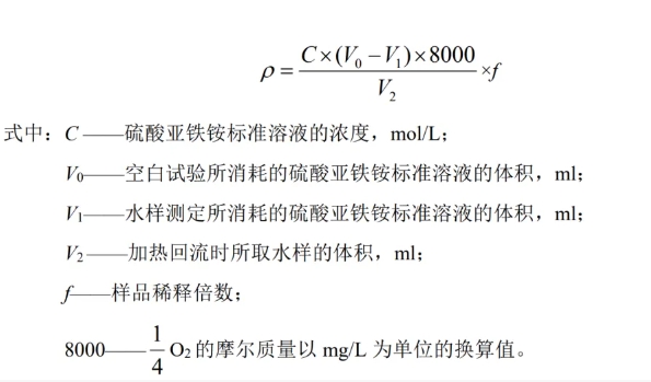 重鉻酸鹽法原理:在水樣中加入已知量的重鉻酸鉀溶液,并在強酸介質下以銀鹽作催化劑,經沸騰回流后,以試亞鐵靈為指示劑,用硫酸亞鐵銨滴定水樣中未被還原的重鉻酸鉀,由消耗的重鉻酸鉀的量計算出消耗氧的質量濃度。[1]