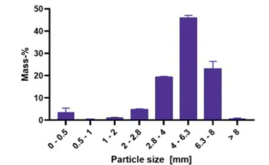 粒度大小分布是影響顆粒狀無機鹽性能的關鍵參數,過多的細小顆粒會增加試劑結塊的風險,從而減弱顆粒狀無機鹽的產品優勢。EMSURE®級顆粒狀無機鹽的一個顯著產品特色是其精確控制的粒度大小分布,主要通過優化干法輥壓制粒生產工藝實現。如下圖2所示,大多數顆粒大小控制在4.0-6.3毫米范圍內,占45%以上。另外約20%的顆粒在2.8-4.0毫米和6.3-8.0毫米的粒徑內,形成了較為集中的粒度大小分布(極少數的細小顆粒<1 mm和超大顆粒>8 mm)。
