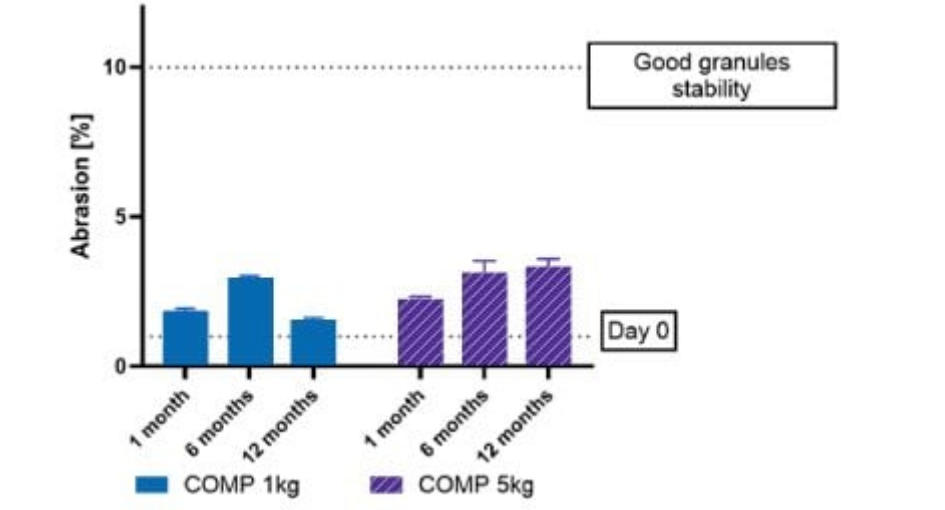 圖5. EMSURE®級顆粒狀二水合磷酸氫二鈉在12個月內的耐磨穩定性測試圖