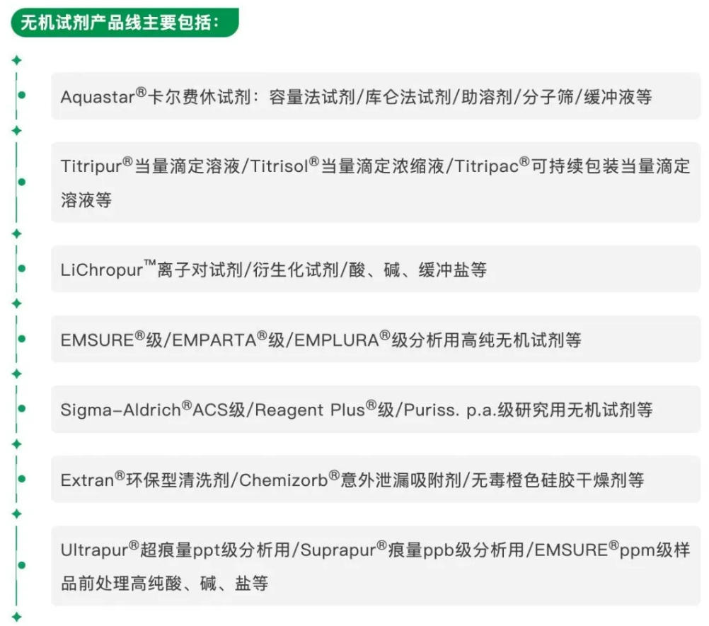 高品質的無機試劑廣泛應用于色譜、光譜、滴定及其它分析技術,為制藥、食品和飲料、環境、新能源電池、半導體等各行各業提供全面的分析產品解決方案。我們與您共同攜手,一起實現分析結果的精準性、準確性和一致性,并滿足法規及監管要求。
