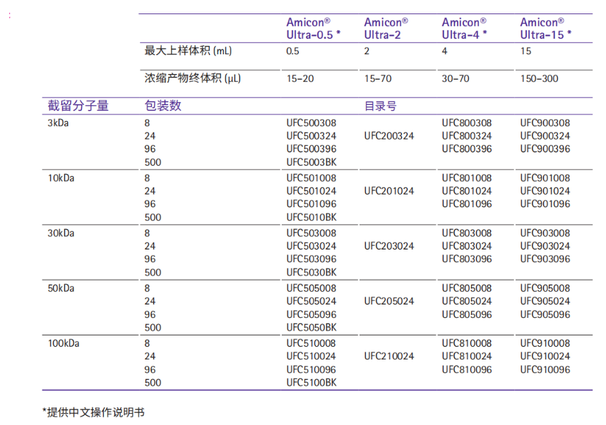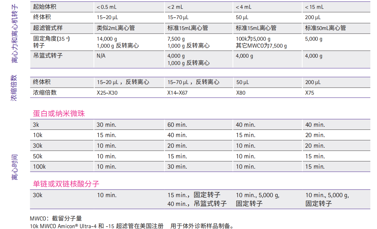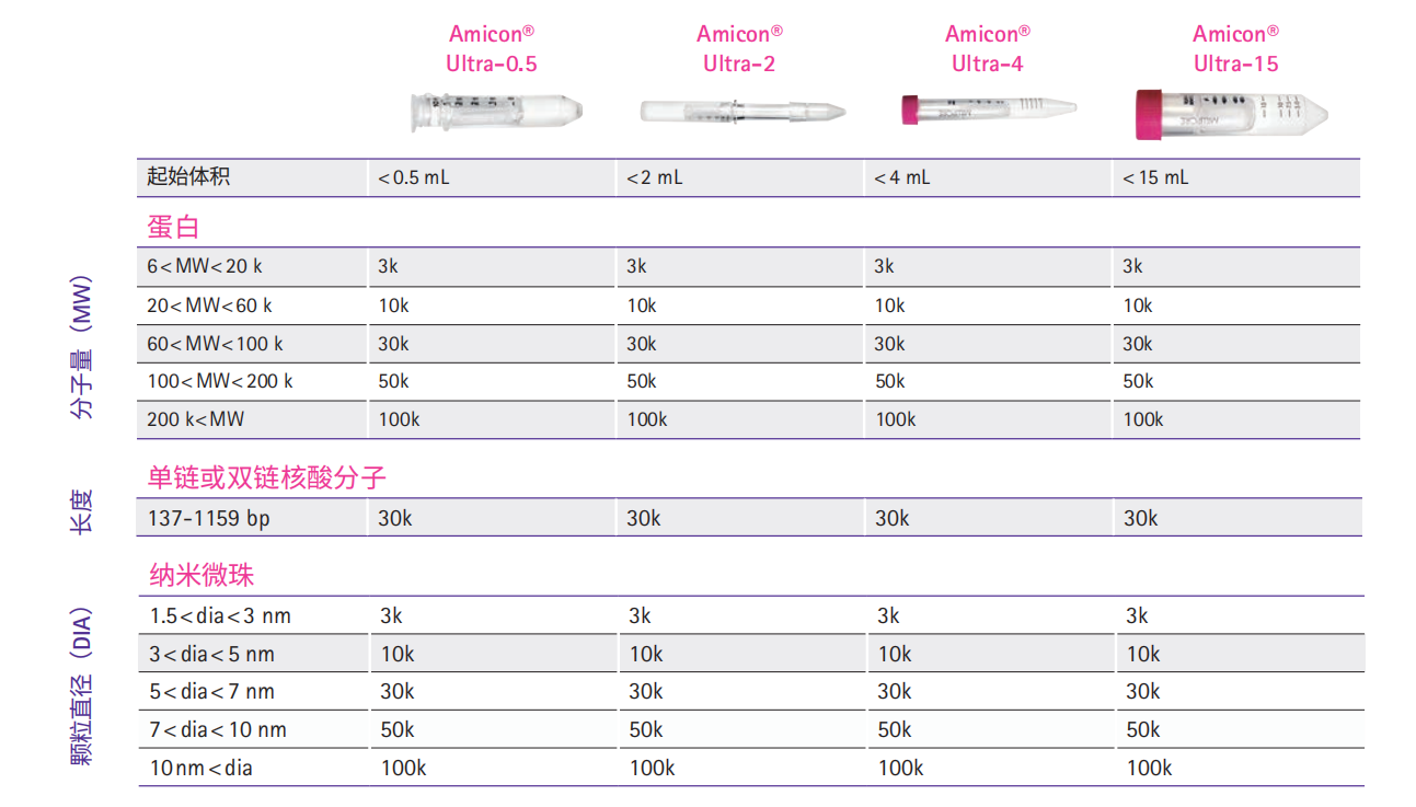 Amicon® Ultra系列超濾管產(chǎn)品需要根據(jù)起始樣品體積、目標(biāo)蛋白或核酸的分子量、終體積及濃縮倍數(shù)等選擇具體型號(hào)。下表為選擇最適合截留分子量的超濾管提供了一些參考建議。
