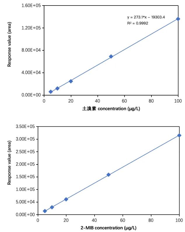 本實驗采用固相微萃取纖維技術吸附飲用水樣品中的土臭素和2-甲基異莰醇,頂空富集,氣相色譜和質譜分離測定,內標校準定量。土臭素和2-MIB的相關系數R分別為0.9992和0.9999。土臭素和2-MIB在20 μg/L條件下的平均加標回收率分別為93.7%和87.7%,RSD分別低至1.4%和1.8%。