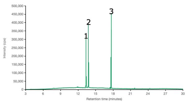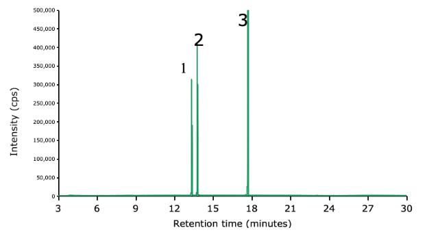 圖2:水樣加標圖譜 (c= 20.0 μg/L)1: 2-isobutyl-3-methoxypyrazine, 2: 2-MIB, 3: geosmin.