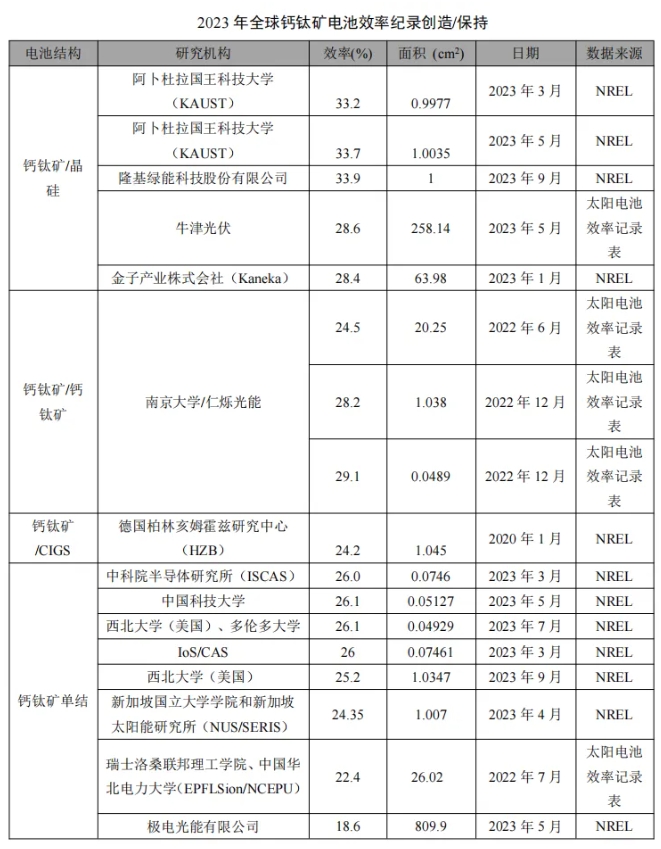截至2024年5月,鈣鈦礦-晶硅疊層太陽電池的世界最高紀錄效率為33.9%(面積:1.0044 cm2),由隆基綠能(LONGi)創造;鈣鈦礦-晶硅疊層小組件的世界最高紀錄效率為28.6%(面積:258.14 cm2),由英國牛津光伏(Oxford PV)保持;鈣鈦礦-鈣鈦礦疊層電池的世界最高紀錄效率為29.1%(面積:0.0489 cm2),由南京大學和仁爍光能(NanjingU/Renshine)保持;鈣鈦礦-鈣鈦礦疊層大面積電池的世界最高紀錄效率為28.2%(面積:1.038 cm2),由南京大學和仁爍光能保持;鈣鈦礦-鈣鈦礦疊層微型組件的世界最高紀錄效率為24.5%(面積:20.25 cm2),也由南京大學和仁爍光能保持。