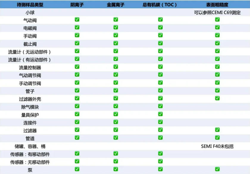 SEMI F57標(biāo)準(zhǔn)規(guī)定了需要的檢測(cè)項(xiàng)目有四類,分別為陰離子污染、金屬離子污染、總有機(jī)碳TOC和表面粗糙度。