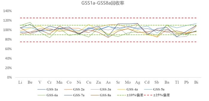 使用PlasmaQuant MS進行分析,由以上結果可知,19種元素回收率大大優于標準要求,并且GSS1a,GSS2a19種元素回收率均滿足標準樣品證書不確定度范圍的要求。
