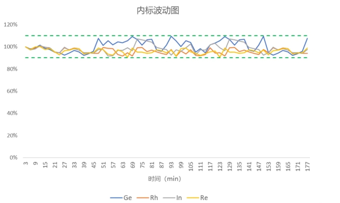 德國耶拿在整個3小時的分析過程中保證內標在90%-110%之間徘徊,證明德國耶拿ICP-MS具有極佳的儀器穩定性,保證分析工作的高效穩定完成。