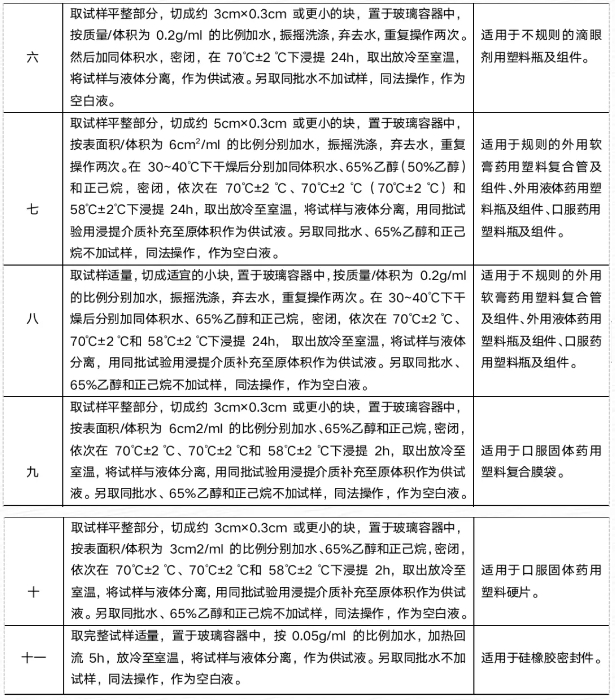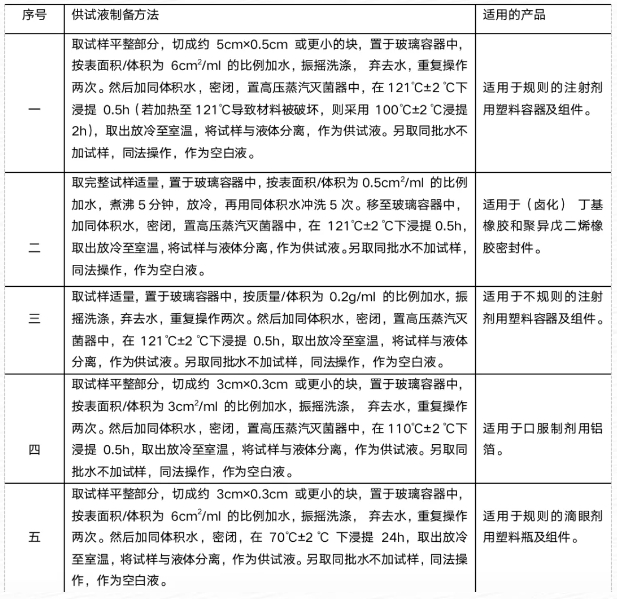 配制線性范圍在0.5~20mg/L的標準曲線,照制藥用水總有機碳測定法(通則0682)分別測定水供試液和空白溶液的TOC含量,計算兩者差。如果供試液的TOC值超出了該線性范圍的上限,則將其進行適當稀釋后再分析。根據不同的盛裝器皿,提取方式也不盡相同。藥包材溶出物測定常用的供試液制備方法見下表。