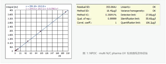 使用multi N/C pharma系列分析儀, 采用NPOC法,曲線范圍0.1 ~ 20 mg/L,采用多點定標的方式,標準溶液用1000 mg/L蔗糖儲備液配制。校準曲線及其特征值如圖1所示。