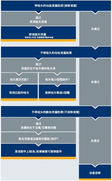 靜態(tài)測(cè)試時(shí)無需按壓移液鍵,即活塞不移動(dòng),這僅能用于確定整個(gè)移液器系統(tǒng)是否存在泄露,無法判斷是否活塞組件的問題導(dǎo)致泄露。