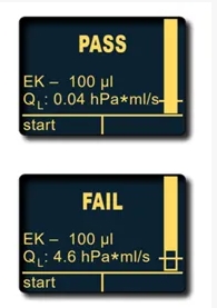 PLT會(huì)依據(jù)國際標(biāo)準(zhǔn)ISO 8655-2對(duì)檢測(cè)情況進(jìn)行判定,在屏幕中顯示結(jié)果,右側(cè)的條形圖表示QL的臨界值與泄露情況。
